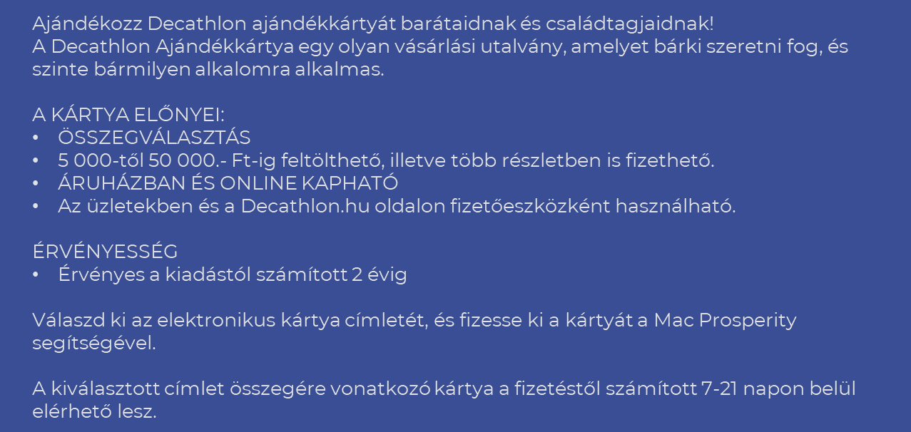 A Decathlon Ajándékkártya egy utalvány 30% kedvezménnyel a Decathlon üzletláncban sportszer, ruházat és lábbeli vásárlására.