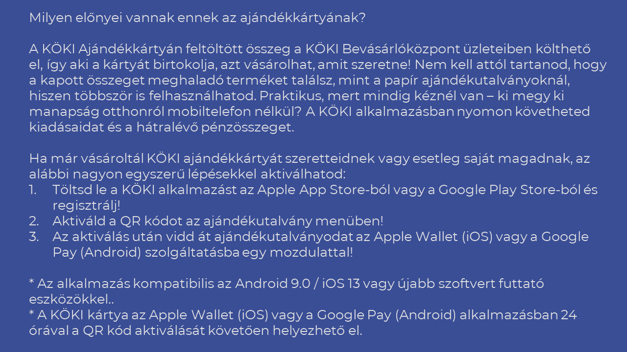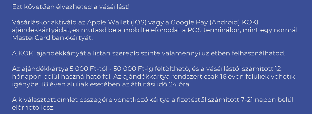 A 30% kedvezményes KÖKI Ajándékkártya egy MasterCard alapú virtuális bankkártya, amely ingyenes biztonságos Apple Wallet (IOS) vagy Google Pay (Android) e-pénztárcába integrálható.
