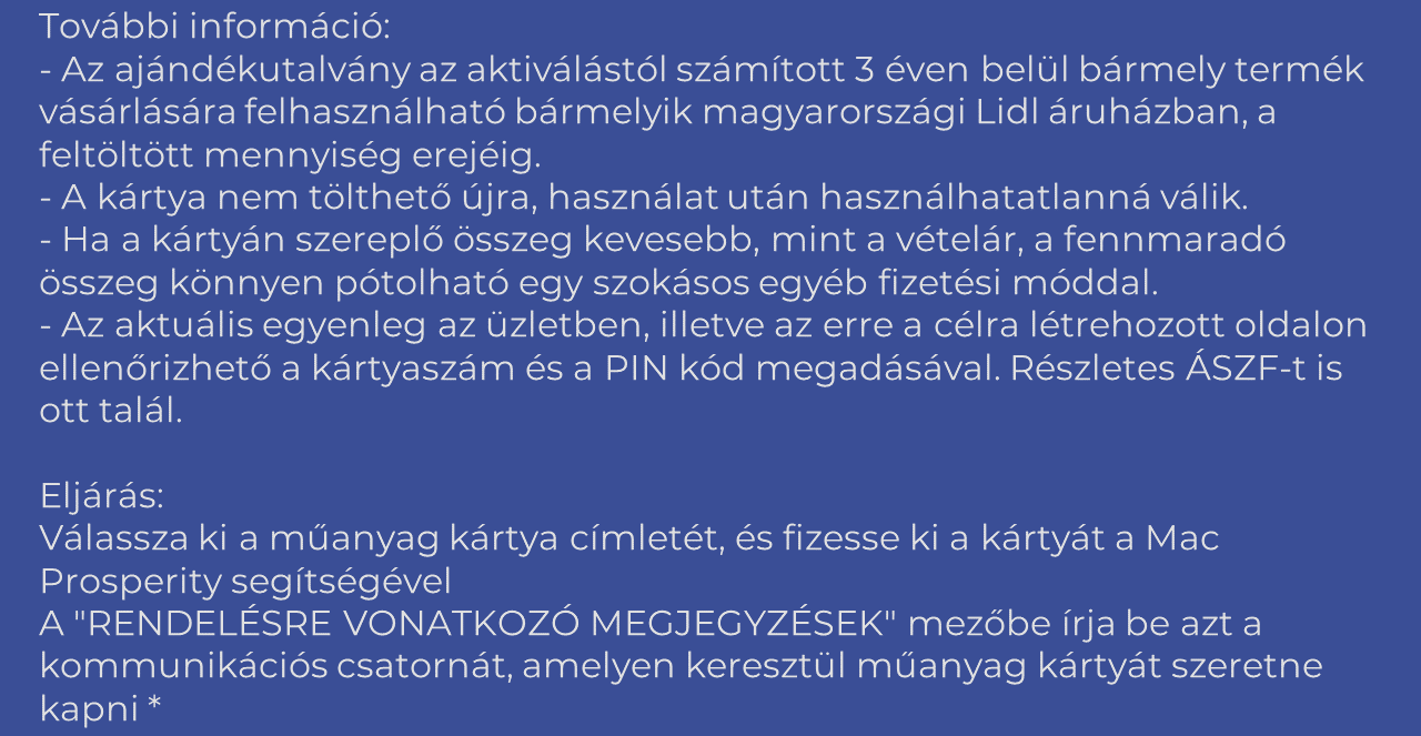 A Lidl 30% kedvezményes műanyag ajándékkártya a Lidl által Magyarországon kibocsátott, nem banki névtelen eldobható elektronikus kártya (QR vagy vonalkód), piaci vásárlásra. (Fizetés MAC PROSPERITY eszközzel).