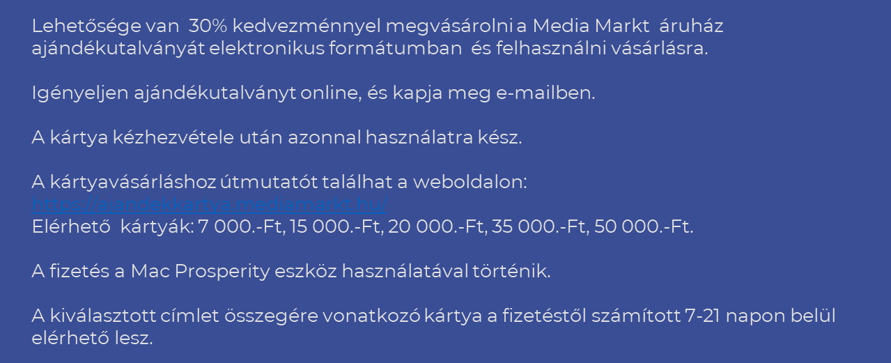 A KENTAVR Csoport 30% kedvezménnyel ad lehetőséget ajándékutalvány vásárlására a Media Markt üzletekben történő vásárláshoz.